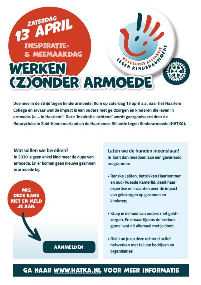 Meld je hieronder aan en kom op zaterdag 13 april a.s. naar het Haarlem College voor het event Werken (z)onder armoede. Ervaar wat de impact is van ouders met geldzorgen en kinderen die leven in armoede en denk mee over praktische oplossingen. Deze ‘Inspiratie-ochtend’ organiseren wij samen met de Rotaryclubs in Zuid-Kennemerland.