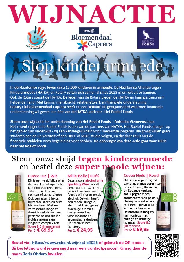 Rotary Club Bloemendaal-Caprera zorgt ervoor dat de opbrengst van deze wijnactie voor 100% ten goede komt aan het Roelof Fonds. Het Roelof Fonds biedt Haarlemse Jongeren die om wat voor reden dan ook ondersteuning nodig hebben bij het volgen van een opleiding een studiebeurs en begeleiding. (Lees er hier meer over.) De Rotary helpt zo mee met de strijd tegen kinderarmoede en steunt onder andere ook de HATKA. Wij zijn ze daar zeer erkentelijk voor!